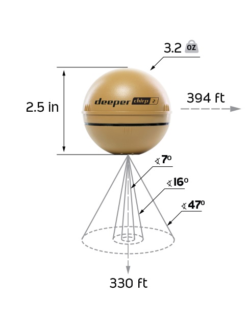 Deeper CHIRP+2 способен обнаруживать подводные объекты на расстоянии до 100 м, подключаясь к вашему смартфону или планшету через встроенный Wi-Fi, поэтому вам не требуется мобильная связь или интернет. Небольшие размеры и легкий вес делают его удобным для транспортировки в коробке для рыболовных принадлежностей или даже в кармане.