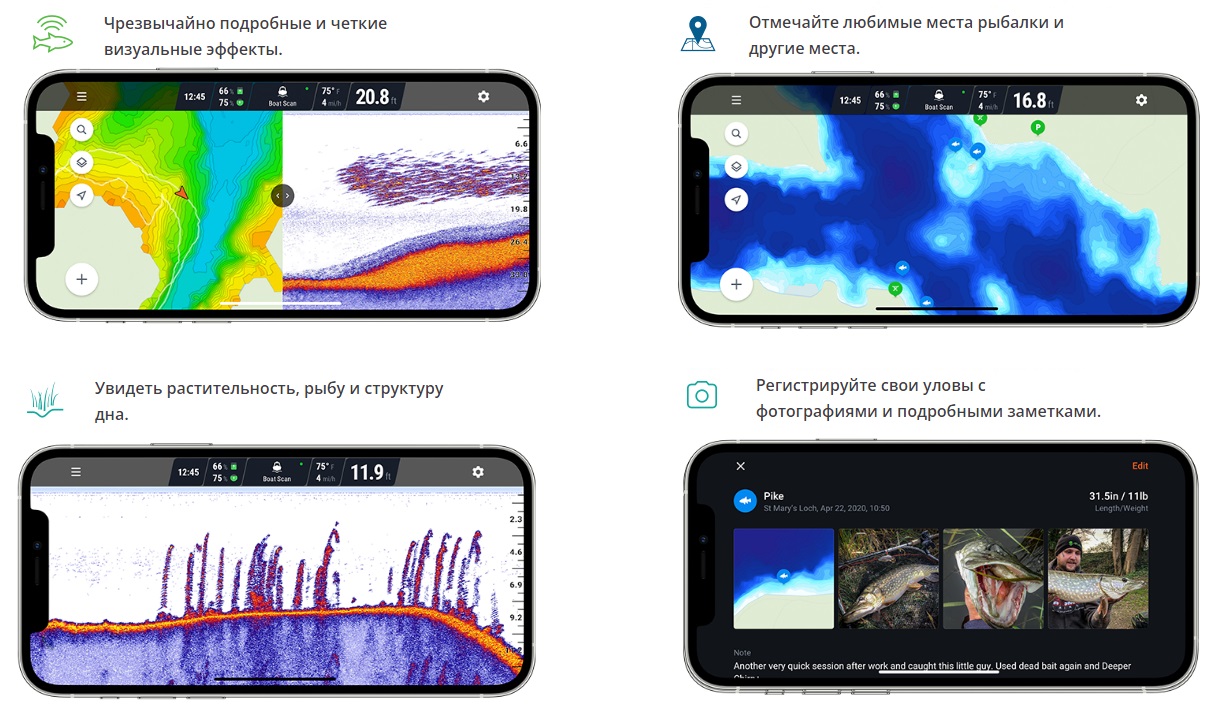 Режимы эхолота: Стандарт, Лодка, Зимняя рыбалка, Берег GPS