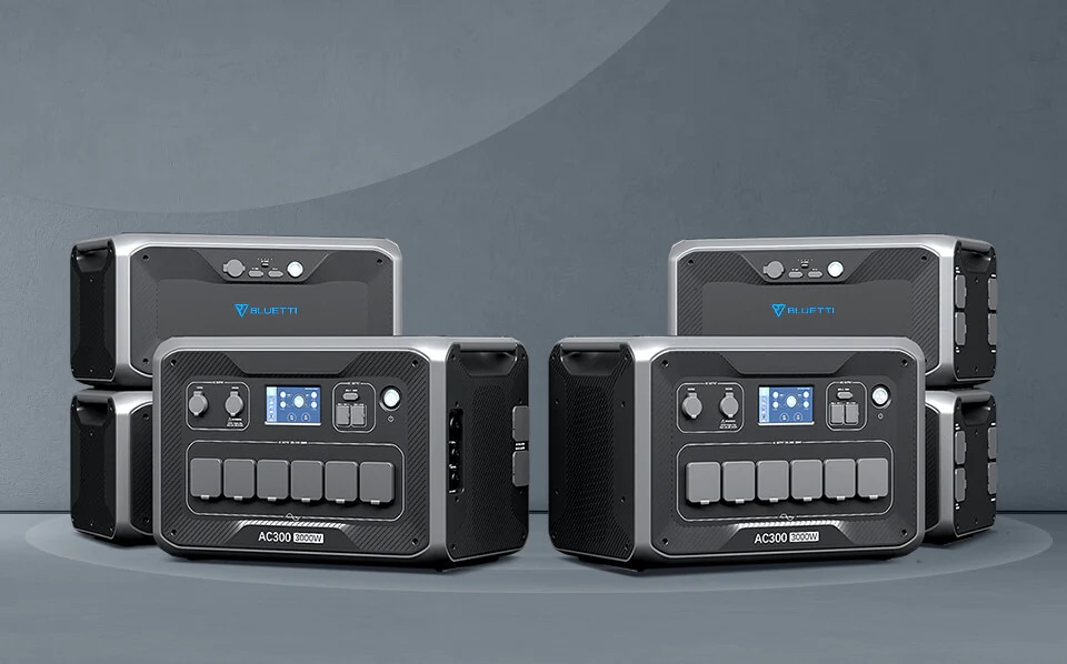 Bluetti AC300 является на 100% модульным и может принимать до 4xB300 (3,072 Втч на единицу) батарейных модулей на блок, чтобы увеличить его емкость до 12 288 Втч.