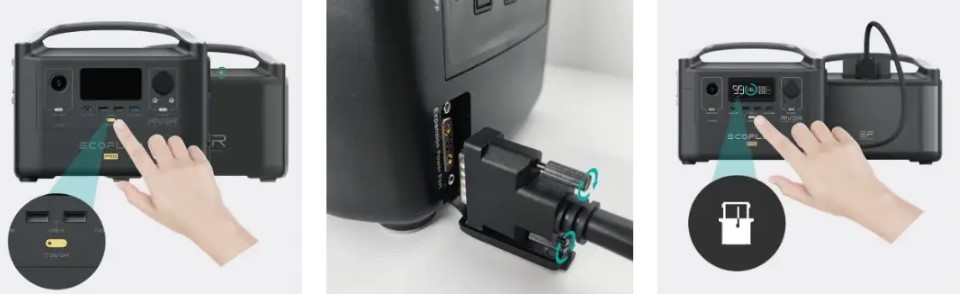 2. Кабель питания расширения подсоедините к порту питания расширения RIVER Pro и затяните винты. Сделайте то же самое для дополнительной батареи RIVER Pro.