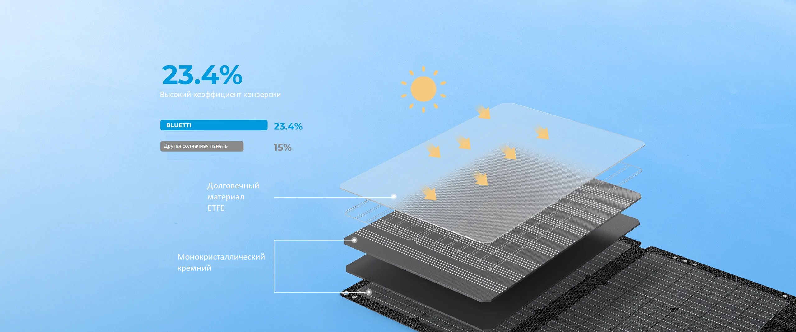 Панель, созданная на основе монокристаллических солнечных элементов, может преобразовывать до 23,4% солнечного света в полезную электроэнергию, обеспечивая вас солнечной энергией даже в плохую погоду. PV68 изготовлен из покрытий ETFE, между тем ламинированная технология и 95% светопропускания позволяют легко улавливать солнечную энергию даже в условиях низкой освещенности.