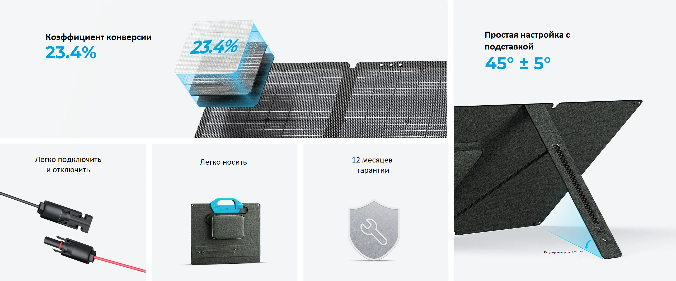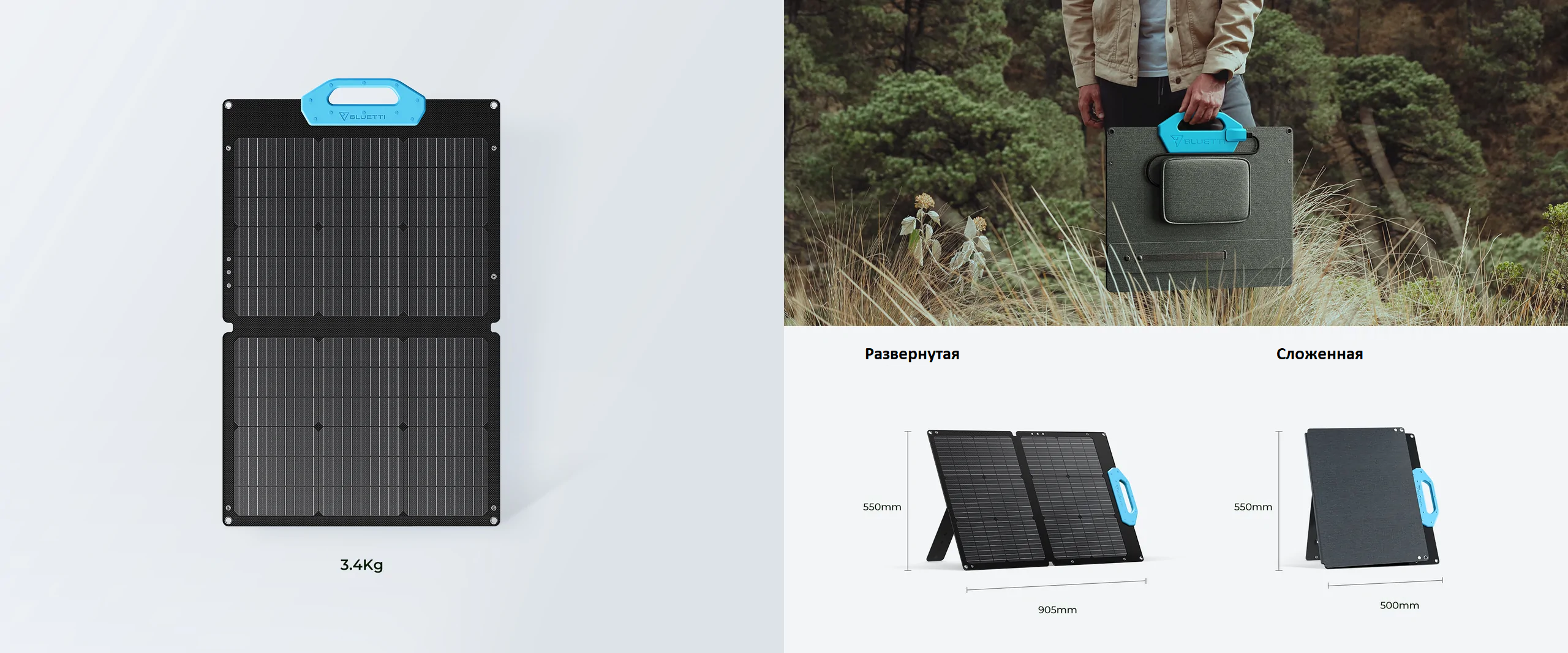 Портативная солнечная панель весит всего 3,4 кг, ее габариты в сложенном виде - 50 х 55 см. Вы можете легко хранить ее дома или взять с собой в путешествие.