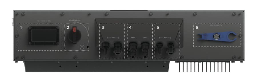 Благодаря безупречному взаимодействию между инвертором и аккумуляторами, система обеспечивает не только эффективную передачу энергии, но и безопасность работы. Встроенные системы безопасности и защиты предотвращают перегрузки и нежелательные ситуации, обеспечивая стабильное энергоснабжение. В этом блоке присутствуют различные разъемы для надежной коммуникации между компонентами системы.