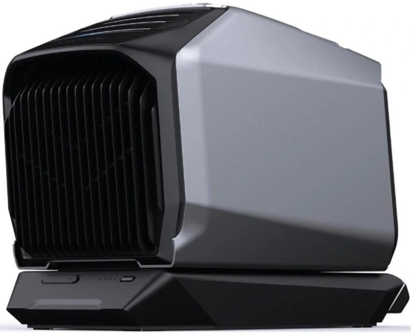 Wave 2 имеет черно-серую отделку и спортивные стильные края, которые придают ему угловатый вид. Воздухозаборник находится за черной решеткой на передней панели устройства ближе книзу, а перегородка наверху подает холодный воздух. Диск управления находится справа от перегородки, а четыре дополнительные кнопки украшают верхний край портативного кондиционера EcoFlow Wave 2. На левой стороне корпуса портативного кондиционера EcoFlow Wave 2 находится порт питания переменного тока, порт для солнечной/автомобильной зарядки и порт для подключения дополнительного аккумуляторного блока.